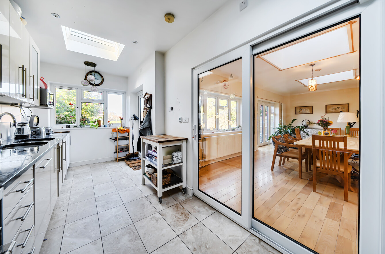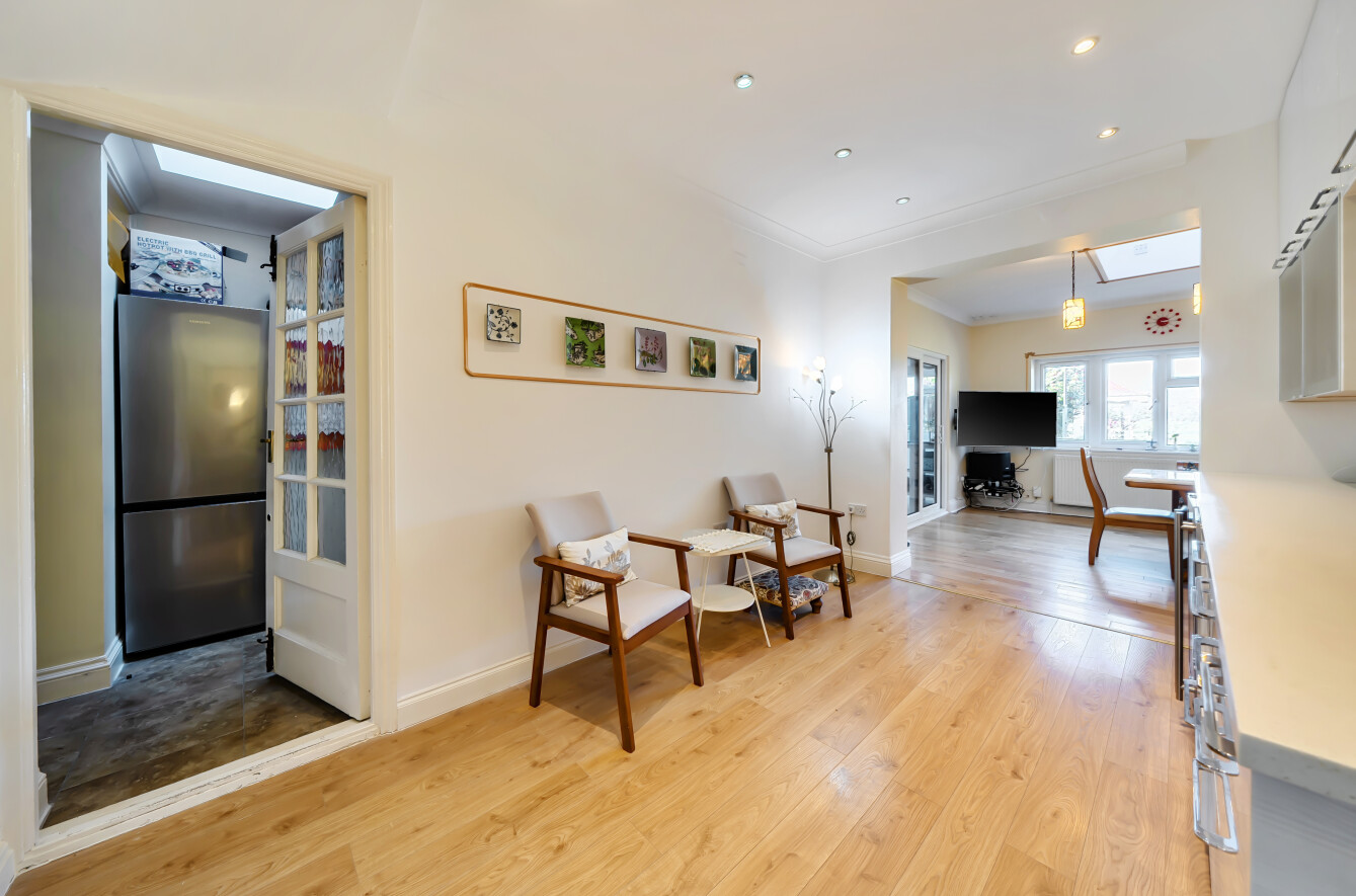 The accommodation comprises entrance hall, front reception, an extended L-shaped double reception room / dining room (with double doors to the rear garden), side extension with own front door, shower room / WC, utility room and kitchen with sliding doors to the dining room.