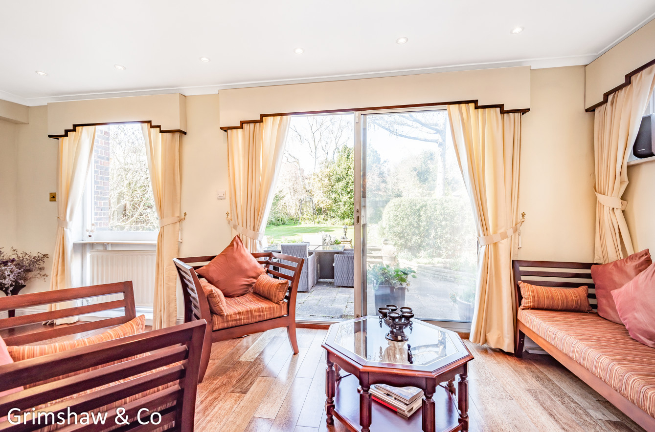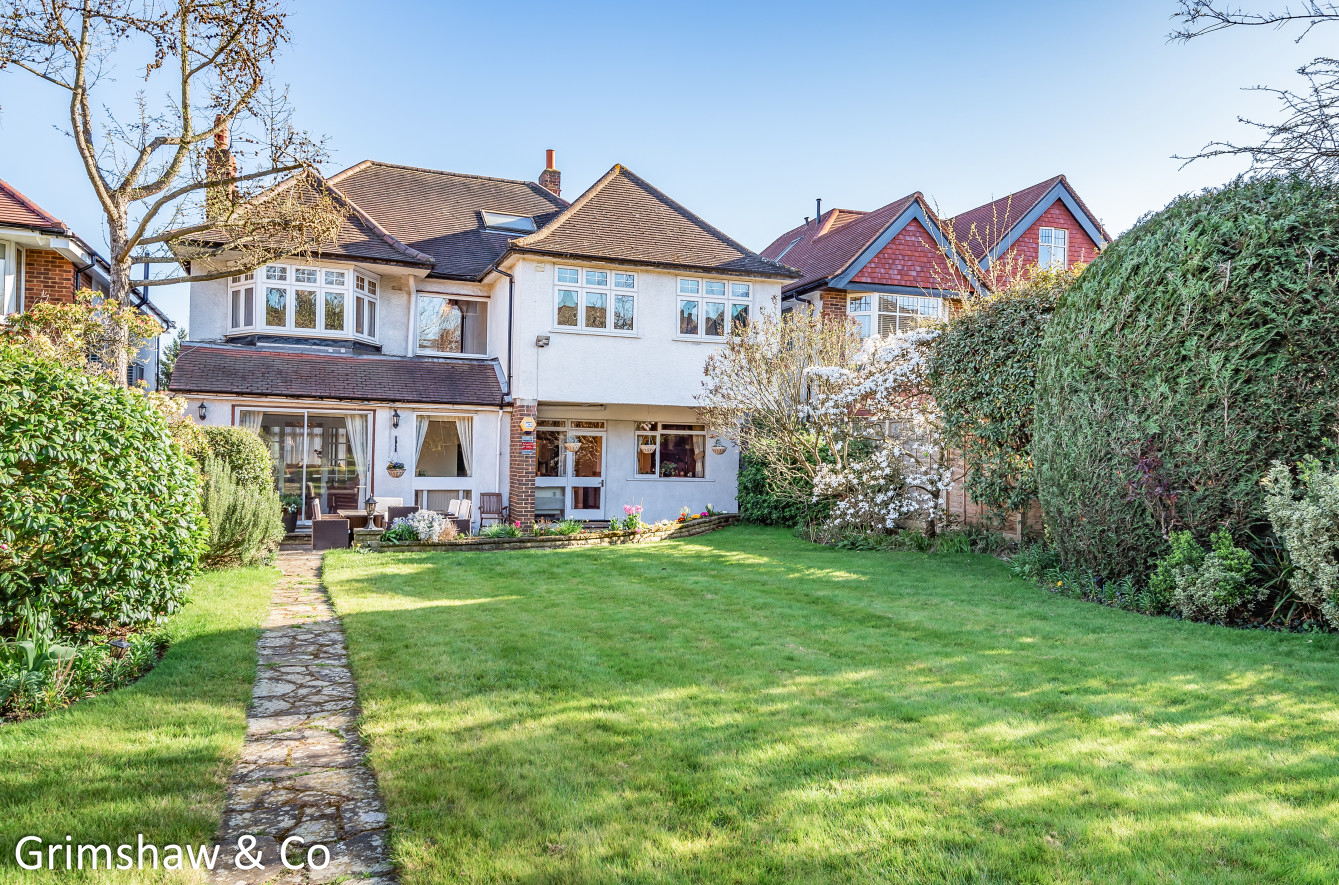 Outside - lovely landscaped rear lawn garden of approx 85’9 x 45’3, front garden and forecourt parking for 2 cars.