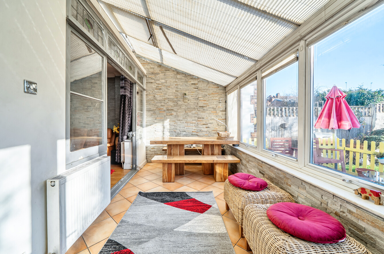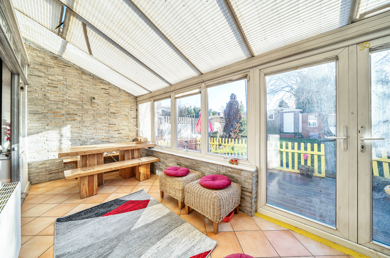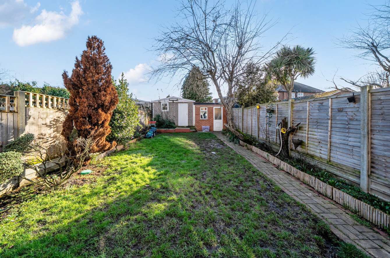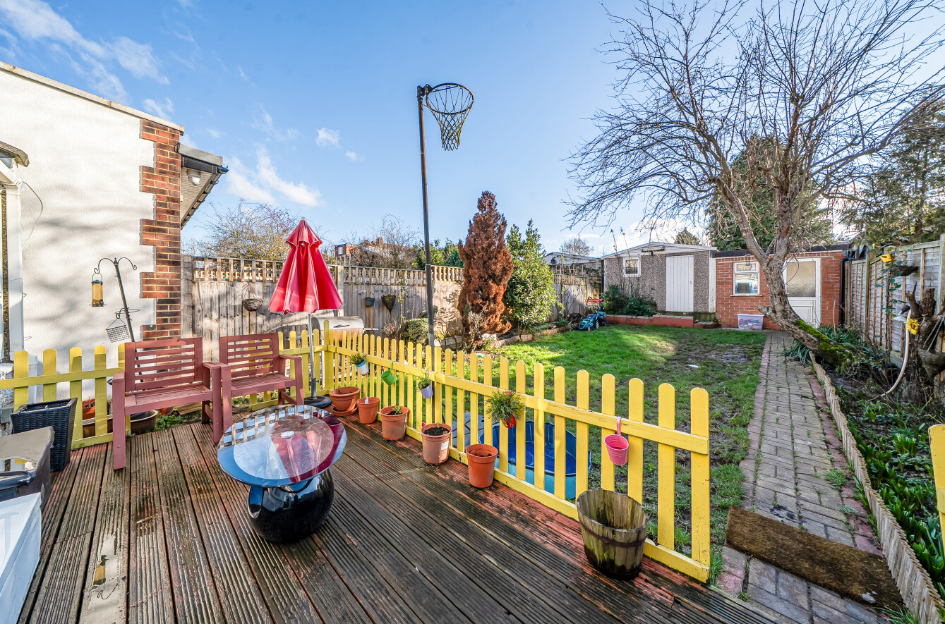 The conservatory at the rear leads to a decked terrace and on to the lovely south-facing rear garden of approx 44ft. At the rear of the garden is a garage and storage shed. At the front is a lawn garden.