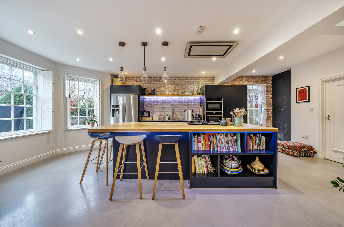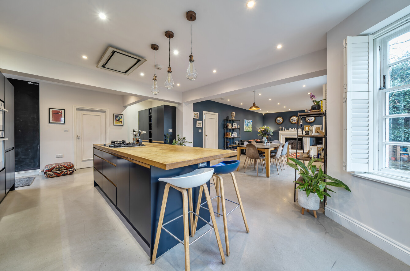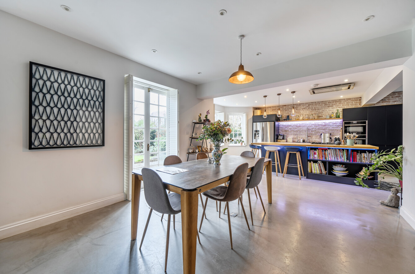 There is a spacious hall leading to an impressive open-plan kitchen / dining room, doors leading onto the large 97ft west-facing garden, a ground-floor WC, a good sized study with skylight and a workshop.